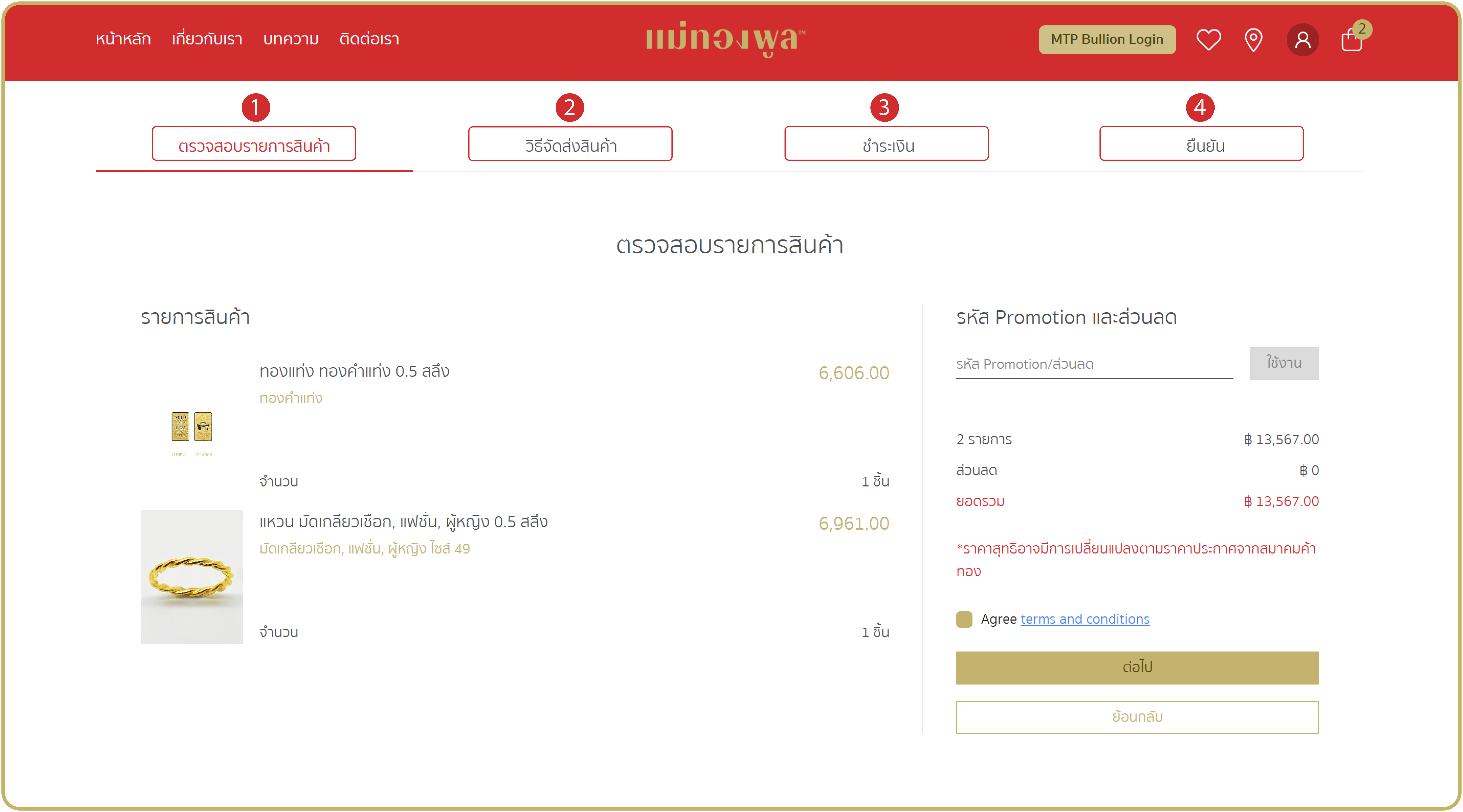 เมื่อทำการตรวจสอบรายการสินค้าที่ต้องการเรียบร้อยแล้ว คลิ๊กที่ปุ่ม ต่อไป เพื่อไปยังขั้นตอนถัดไป (2, 3, 4) ในการเลือกวิธีจัดส่งหรือรับสินค้า และชำระเงิน
