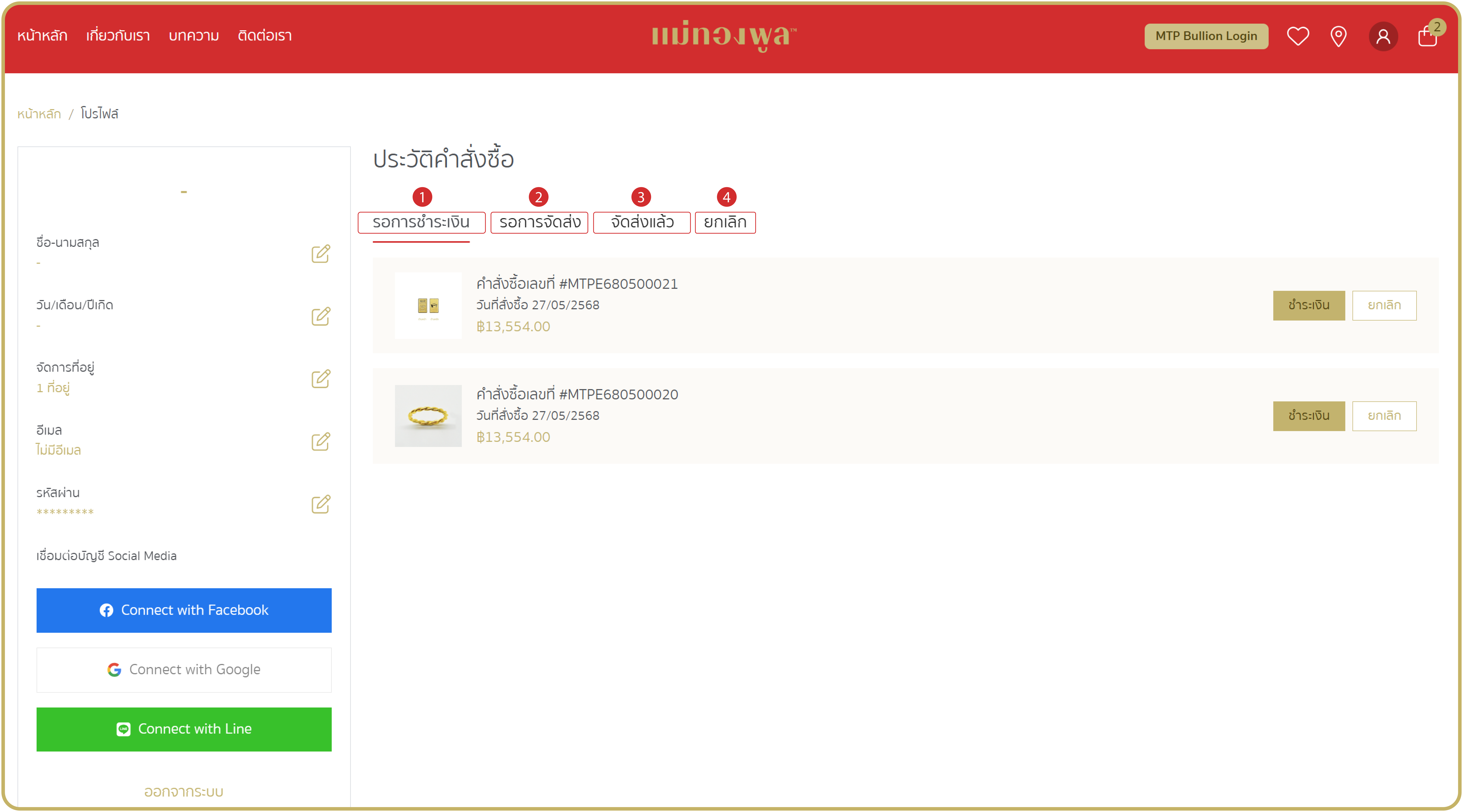 เมื่อทำการลงทะเบียนเรียบร้อยแล้ว ที่หน้าProfileของท่าน จะแสดงประวัติคำสั่งซื้อ แบ่งเป็น 4 สถานะ